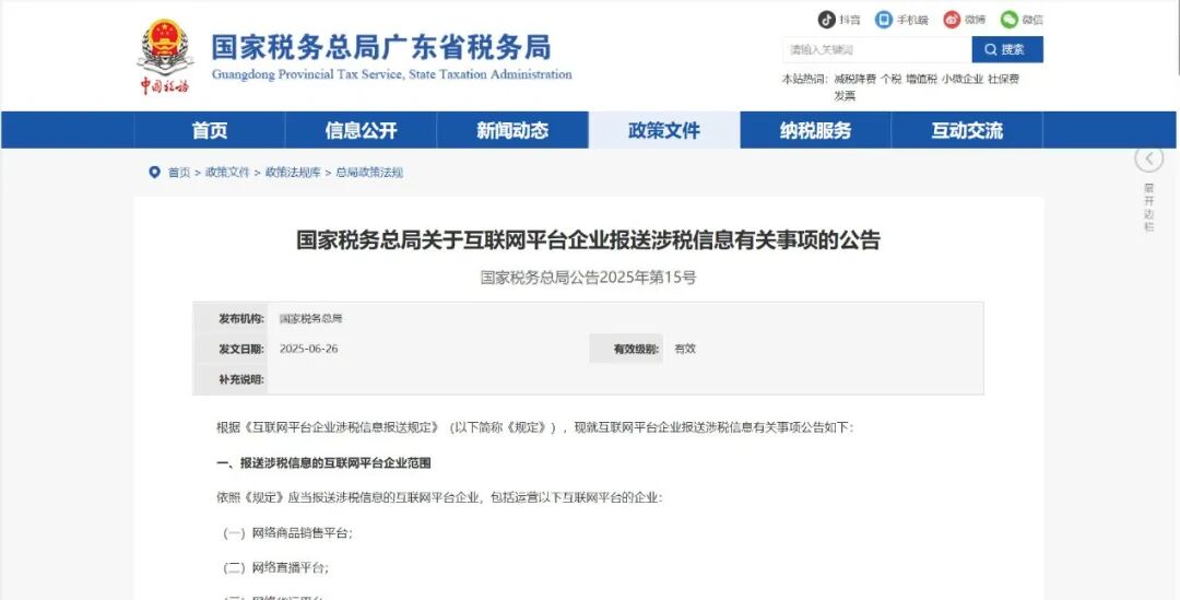 国家税务总局发布了《国家税务总局关于互联网平台企业报送涉税信息有关事项的公告》,简称15号公告,明确了境内和境外互联网平台在报送涉税信息方面的责任。